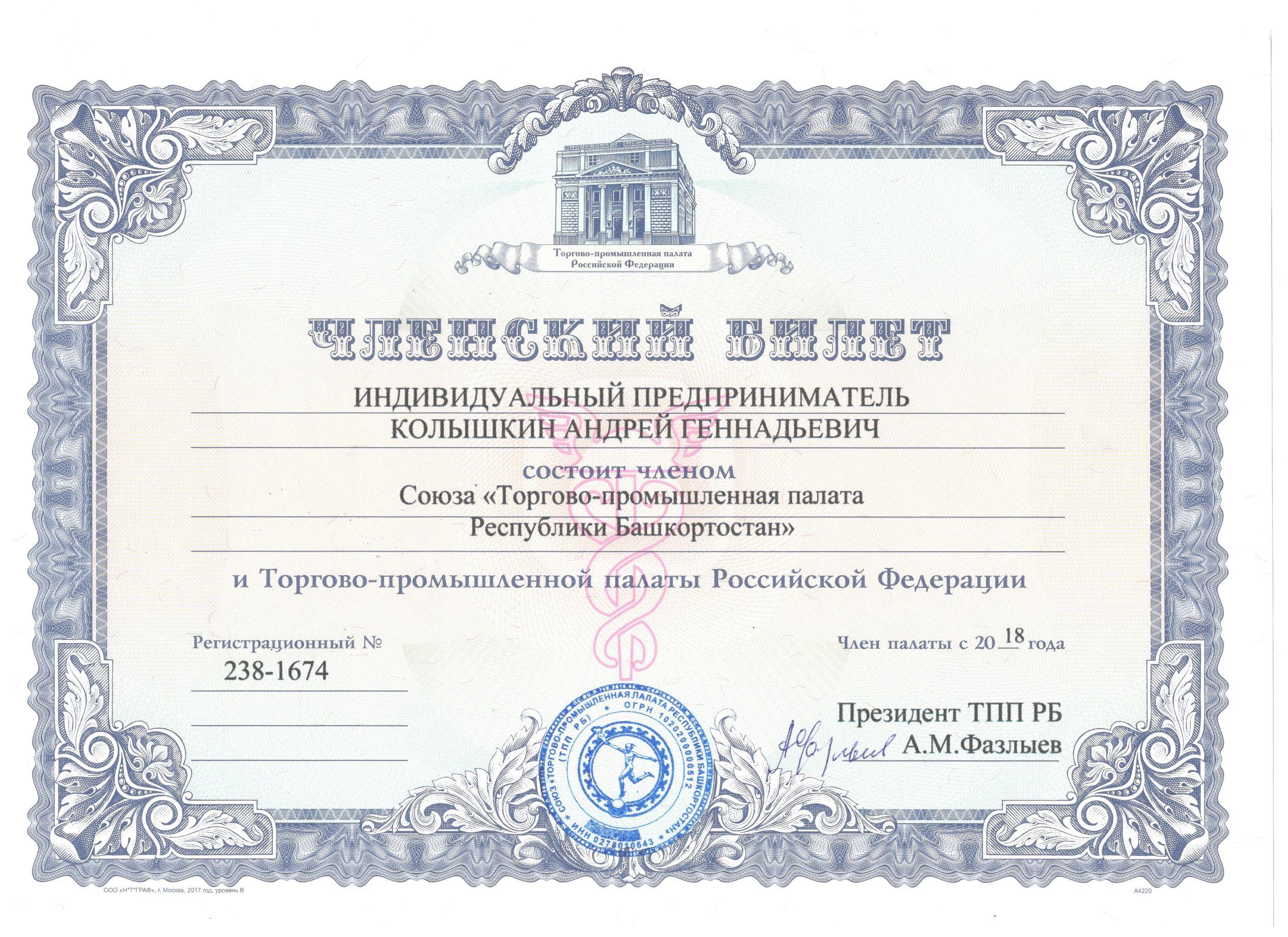 Членский билет союза торгово-промышленной палаты РБ